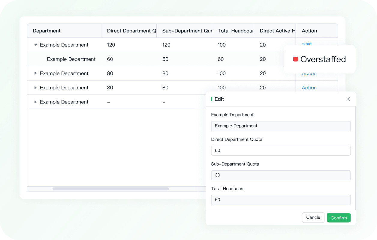Pegang kendali penuh atas batas anggaran Anda. Sistem kami mendukung pengaturan Strong Control (ketat) dan Weak Control (fleksibel) untuk memantau batas headcount guna mengelola risiko kelebihan staf secara efektif.