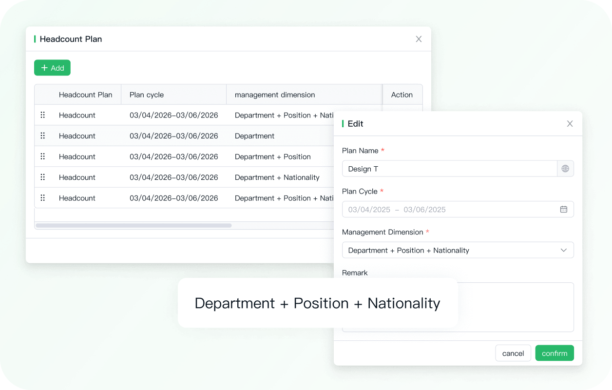Anda dapat mengonfigurasi perencanaan berdasarkan departemen, posisi, kewarganegaraan, dan dimensi waktu. Ini memastikan sistem sesuai dengan matriks organisasi spesifik Anda secara sempurna.